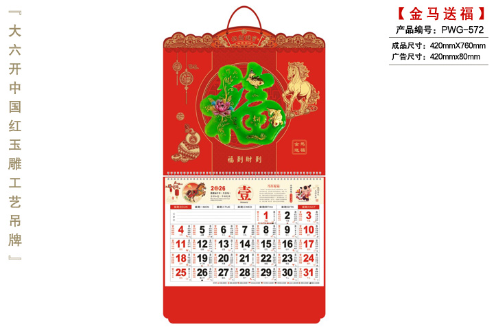 商品描述:產(chǎn)名:2026馬年掛歷,規(guī)格:45X68,系列:大三開(kāi)透雕工藝掛歷,工期:通版3-7天,專版10-15天